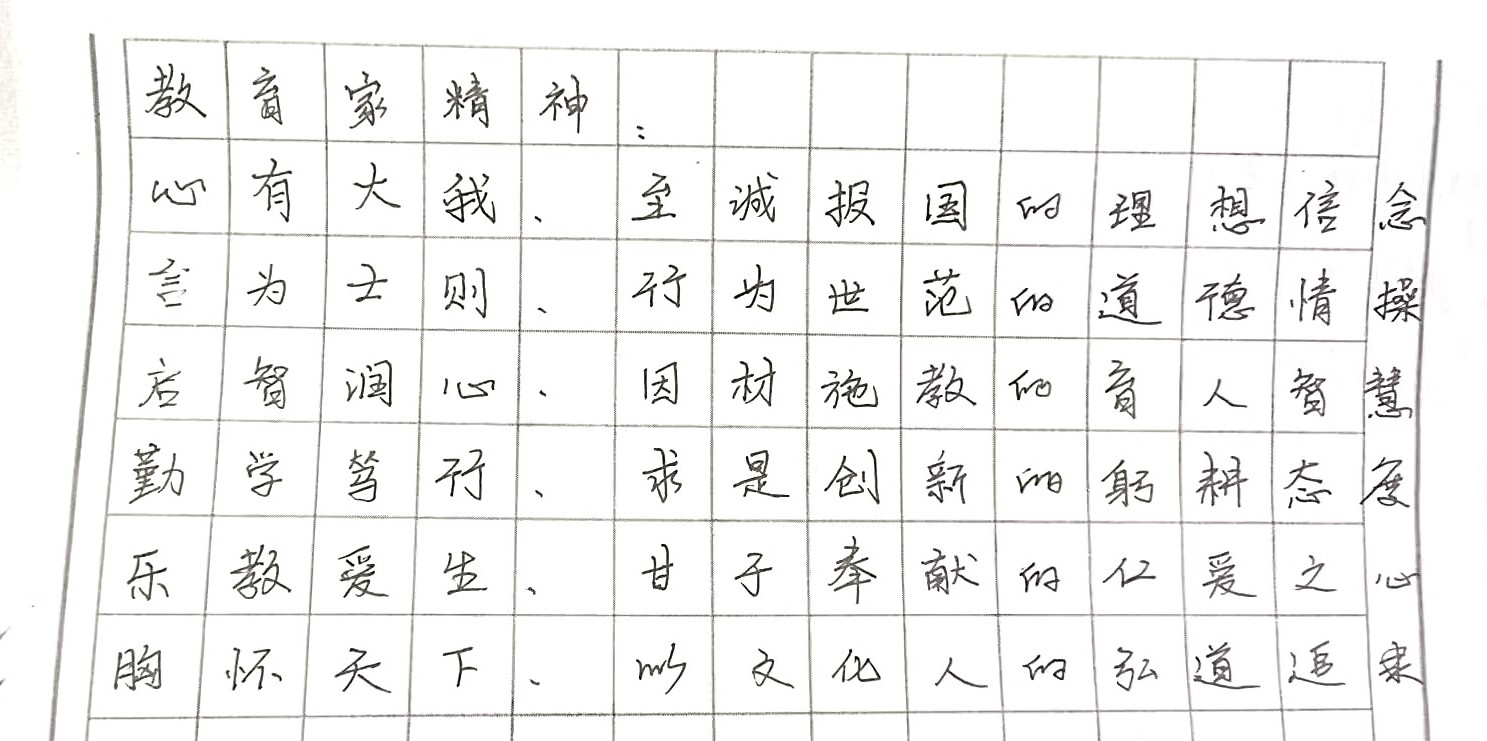 活动以“教育家精神”为书写内容,教职工们采用铅笔、钢笔、签字笔或粉笔等多形式书写。他们书写笔画清楚有力、结构工整匀称、字体美观。