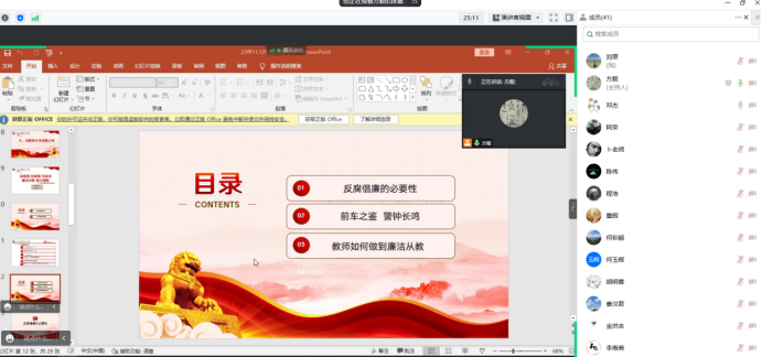 学院党总支负责人向与会人员传达学校关于党风廉政建设的相关要求,并对学院全体教师进行廉洁教育警示。他要求全体教师要提高政治站位,深刻认识警示教育的重要性;要保持政治清醒,认真吸取违纪违法案例教训;要压实政治责任,确保全面从严治党落到实处。