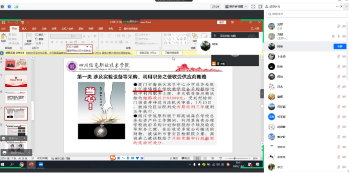11月1日下午,智能控制学院党总支以围绕“知敬畏、存戒惧、守底线、廉洁从教、践行师德”主题进行开展本次党风廉政建设主题党日活动。学院全体教职工参加会议。学院党总支负责人主持会议。