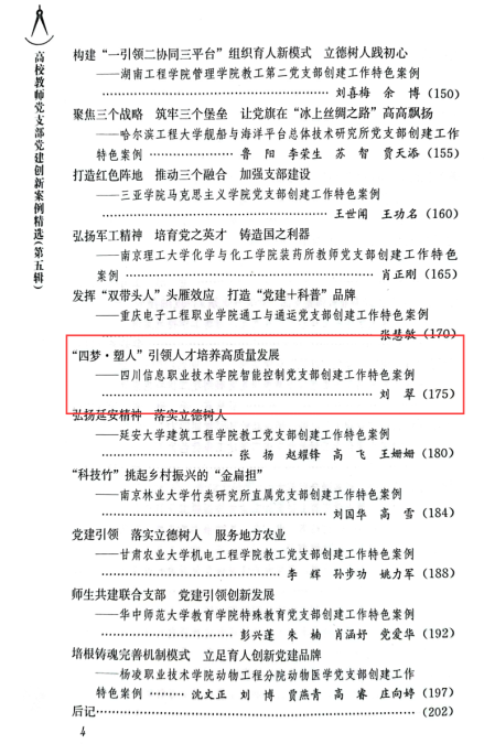 近日,由教育部全国党员教育培训示范基地、华中师范大学培训中心组编的《高校教师党支部党建创新案例精选》(第五辑)一书,经华中师范大学出版社正式出版全国发行。我校智能控制党支部工作案例《四梦·塑人引领人才高质量发展》(刘翠)成功入选。