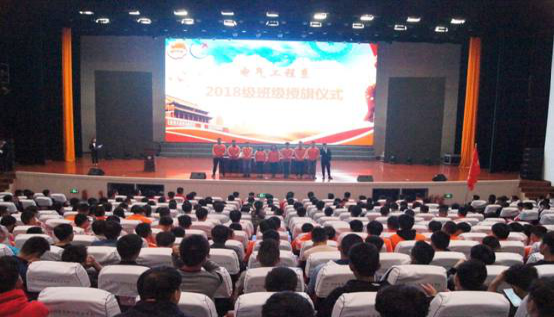 会上, 2018级各班班委依次上台宣誓,表达了服务集体、奉献集体,带领班集体健康发展,争创优秀的决心,电气工程系党总支负责人分别为2018级各班授旗。