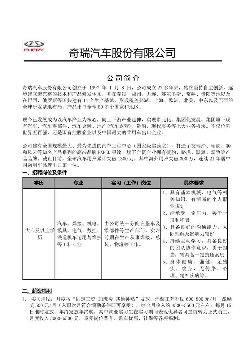 奇瑞汽车招聘简章