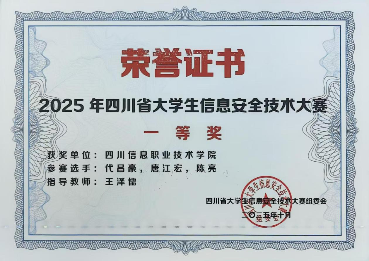 10月26日,由四川省教育厅主办,中共四川省委网信办和四川省公安厅指导的2025年四川省大学生信息安全技术大赛在成都信息工程大学双流新型产业学院圆满落下帷幕。我院网络与通信学院王泽儒老师指导的川信一队、冯军军老师指导的川信二队,分别荣获大赛一等奖和三等奖。