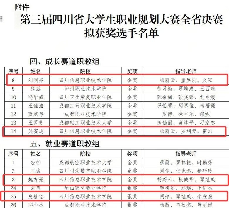 3月13日至15日,在四川省教育厅、四川省人力资源和社会保障厅联合主办的第三届四川省大学生职业规划大赛决赛上,我院电子与物联网学院学生魏方亮、智能控制学院学生史桂铭分别获职教组就业赛道金奖和银奖,电子与物联网学院学生吴安虎、智能控制学院学生刘钊齐同时获职教组成长赛道金奖。