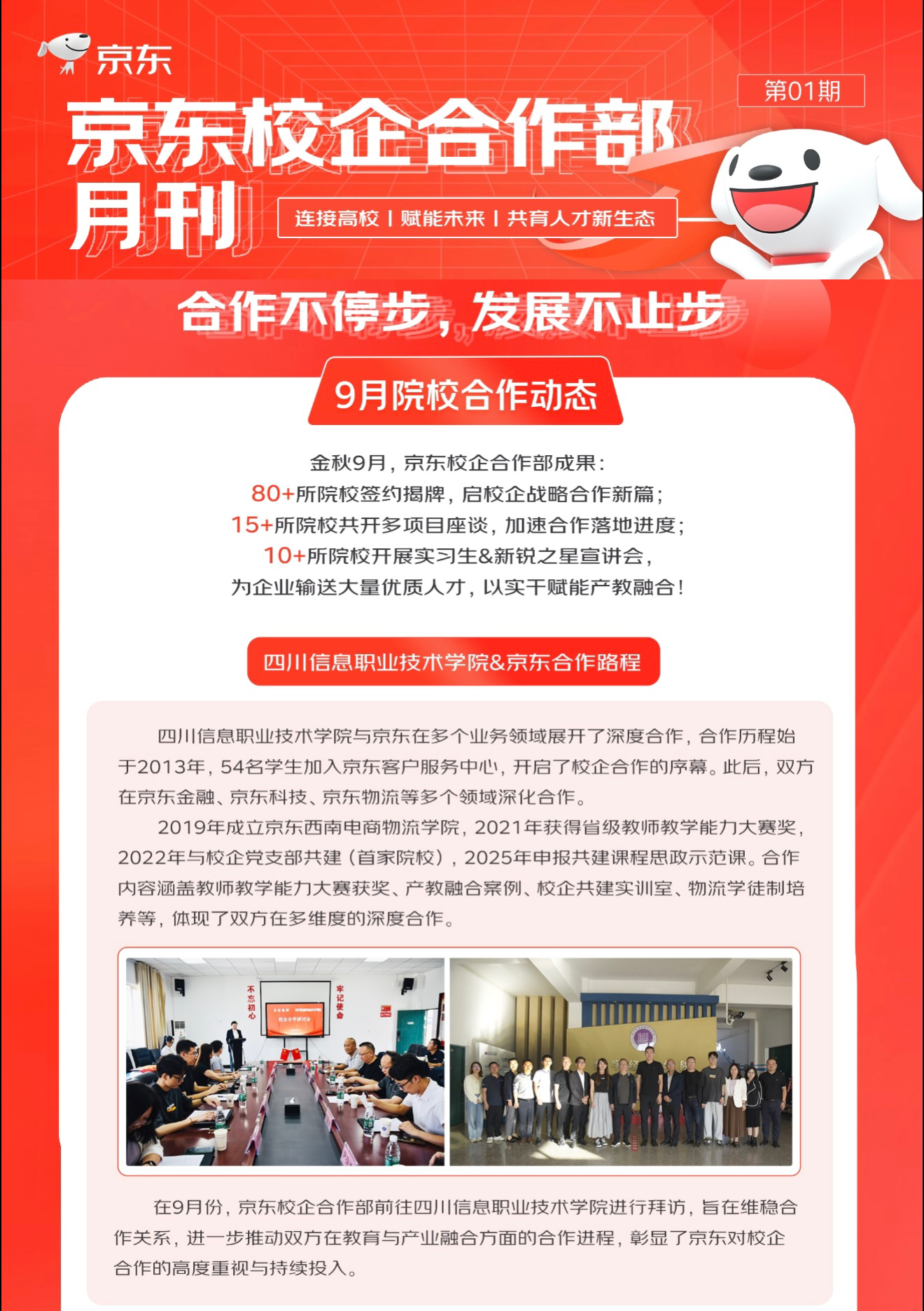 此次登上京东校企合作部月刊首刊,是对学院与京东多年合作成效的权威认可,也彰显了企业对学院人才培养质量的高度信赖。在近期双方的走访交流中,校企进一步达成共识,未来将持续深化教育与产业的融合联动,积极跟进课程建设,深化企业真实项目融入课堂教学,以更精准的合作模式赋能人才成长,为数字经济产业发展输送更多实用型、技能型优质人才。