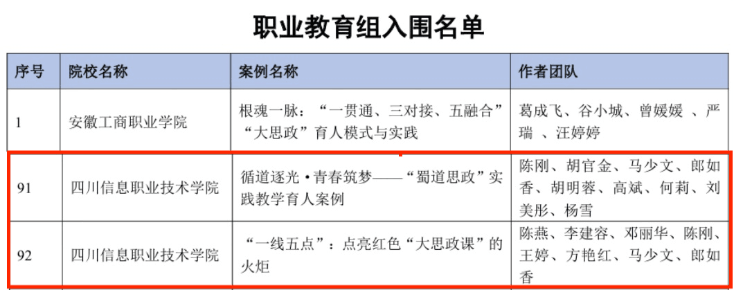 近日,由高等教育出版社、新华网联合开展的高校“大思政课”实践教学典型案例征集活动结果公布。我院马克思主义学院报送的《循道逐光·青春筑梦——“蜀道思政”实践教学育人案例》和《“一线五点”:点亮红色“大思政课”的火炬》两项案例成功入选。本次全国共有292个案例入选,其中普通本科教育组171个,职业教育组121个。四川省8所高职院校的9个案例入选。